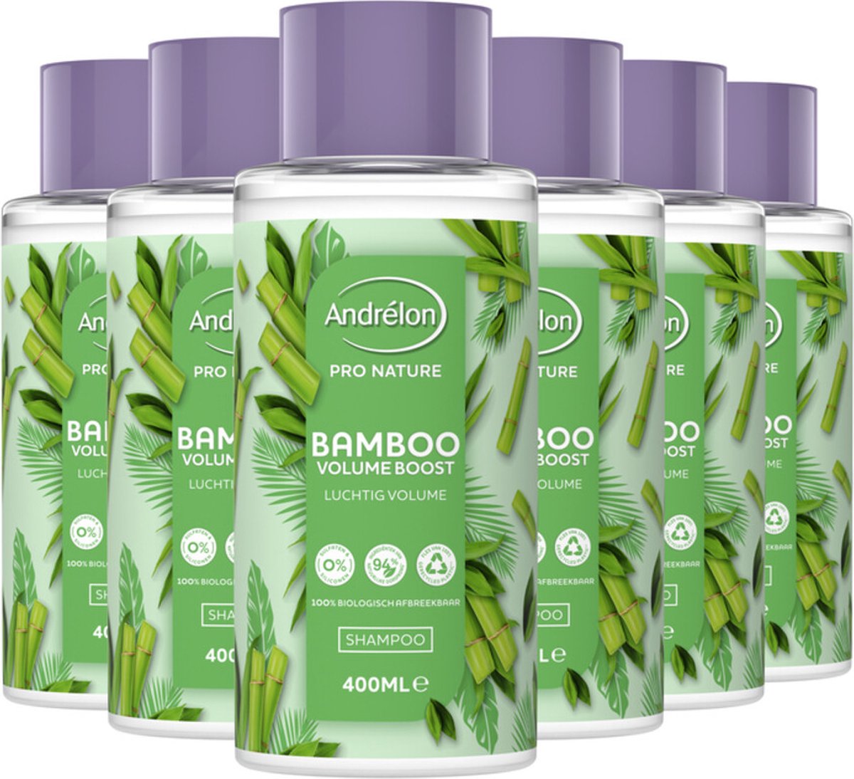 6x Andrelon Shampoo Bamboo Volume Boost 400 ml wordt verkocht in een mooie van 2400 ml. Daarnaast komen ze in een kwantiteit van 6 stuk(s) per doos.