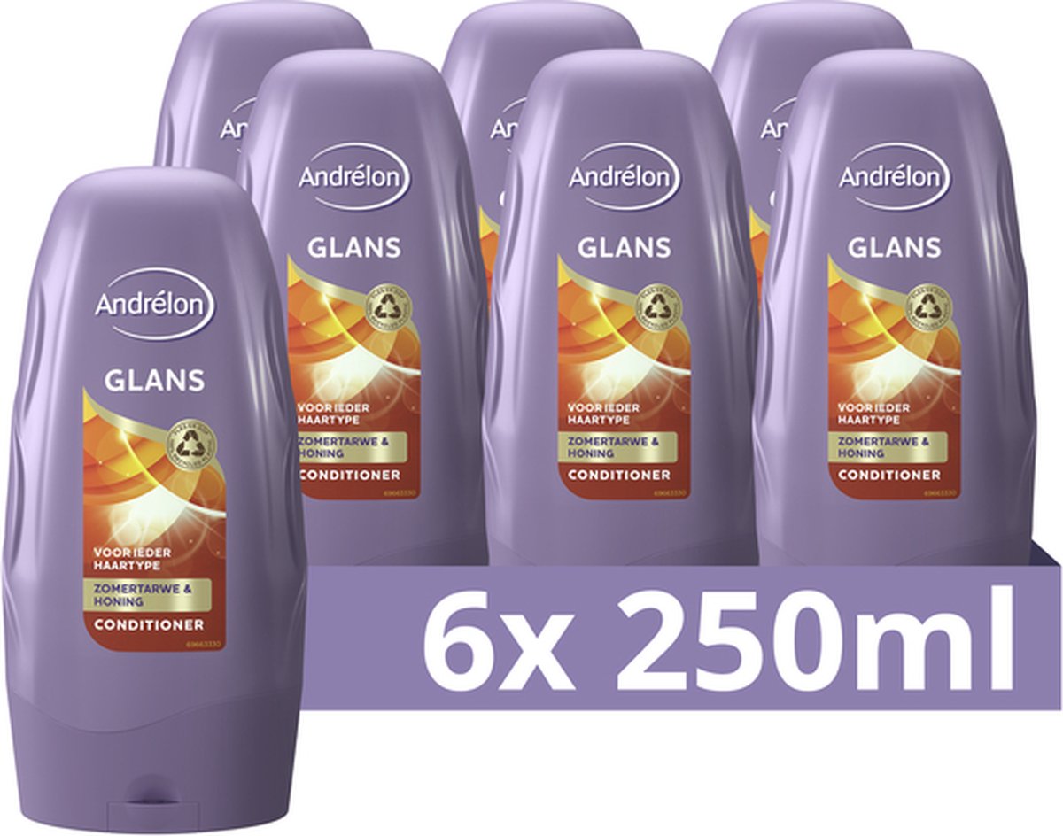 Ervaar de voordelen van de Andrélon Classic Glans Zomer Tarwe Conditioner 6 x 250 ml Voordeelverpakking. Deze conditioner is speciaal samengesteld met zomertarwe en honing, ingrediënten die bekend staan om hun zuiverende en hydraterende werking. Laat je haar weer stralen met de diepe, natuurlijke glans die deze conditioner geeft. Bovendien voelt je haar heerlijk zacht aan na gebruik. De lichtgewicht formule van deze conditioner dringt diep door tot in de kern van je haar, zonder het te verzwaren. Hierdoor blijft je haar luchtig en vol volume. Daarnaast zorgt de Andrélon Classic Glans Zomer Tarwe Conditioner ervoor dat je haar na het wassen heerlijk ruikt en makkelijk doorkambaar is. Geniet van de frisse geur en het gemak van klitvrij haar. Deze conditioner is gemaakt met 98% ingrediënten van natuurlijke oorsprong, waardoor je haar wordt verzorgd op een milde en natuurlijke manier. Bovendien is zowel de fles als de dop van deze conditioner 100% recyclebaar. Draag dus bij aan een duurzamere wereld door de fles bij het plasticafval weg te gooien. Gebruiksaanwijzing: Knijp in de fles en verdeel een beetje conditioner over de lengte van je haren. Laat het even inwerken en spoel het daarna grondig uit. Voor een optimaal resultaat kun je ook de andere producten uit de Andrélon Glans lijn gebruiken. Voel je weer stralend en zelfverzekerd met het gezonde en glanzende haar.