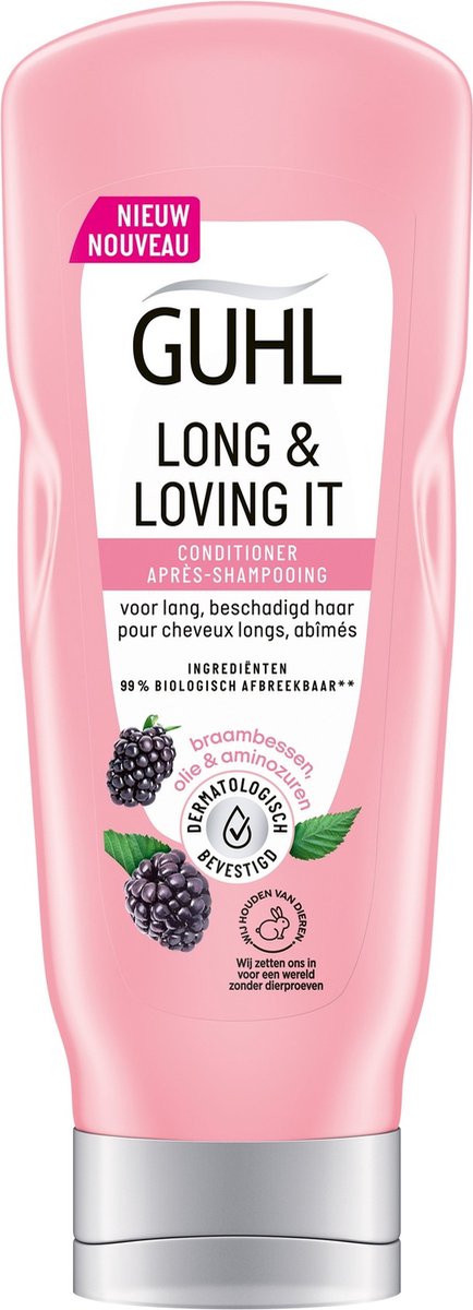 Guhl Long & Loving It conditioner is speciaal ontwikkeld voor lang, beschadigd haar. Deze conditioner herstelt en versterkt lange haren en punten zonder ze te verzwaren. Het resultaat is zijdezacht haar met een natuurlijke souplesse en gemakkelijke doorkambaarheid. Je haar ziet er gezond, glanzend en levendig uit. De formule van deze conditioner bevat antioxidantrijke braambes, voedende amandelolie en versterkende aminozuren. Deze ingrediënten geven je haar de kracht en souplesse die het nodig heeft. Bovendien is deze conditioner dermatologisch getest en bevat het geen siliconen. Het is een veganistische formule, wat betekent dat er geen ingrediënten van dierlijke oorsprong in zitten. Daarnaast is de verpakking van deze conditioner recyclebaar, waardoor je ook nog eens bijdraagt aan een duurzame wereld. De ingrediënten zijn voor 98% van natuurlijke oorsprong en tot 99% biologisch afbreekbaar volgens de OESO-richtlijnen. Kortom, Guhl Long & Loving It conditioner biedt vele voordelen voor lang, beschadigd haar en is een milieubewuste keuze.