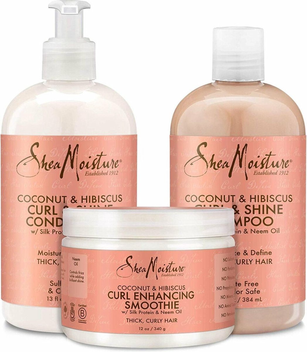 Shea Moisture Coconut Hibiscus Shampoo Conditioner Curl Enhancing Smoothie Curl Shine Care Pakket van 3 wordt verkocht in een mooie Pomp van 1108 ml. Daarnaast komen ze in een kwantiteit van 3 stuk(s) per doos.